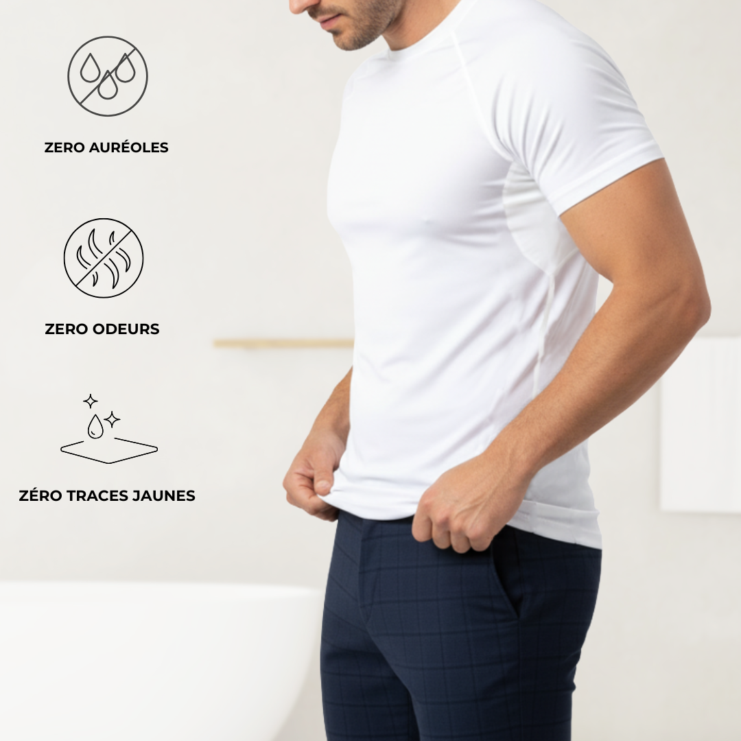 La transpiration peut impacter la confiance. Nos vêtements sont une réponse discrète et efficace à ce problème. Ils absorbent, bloquent et évacuent l’humidité là où cela compte, pour que vous restiez concentré sur vos objectifs, pas sur vos vêtements.